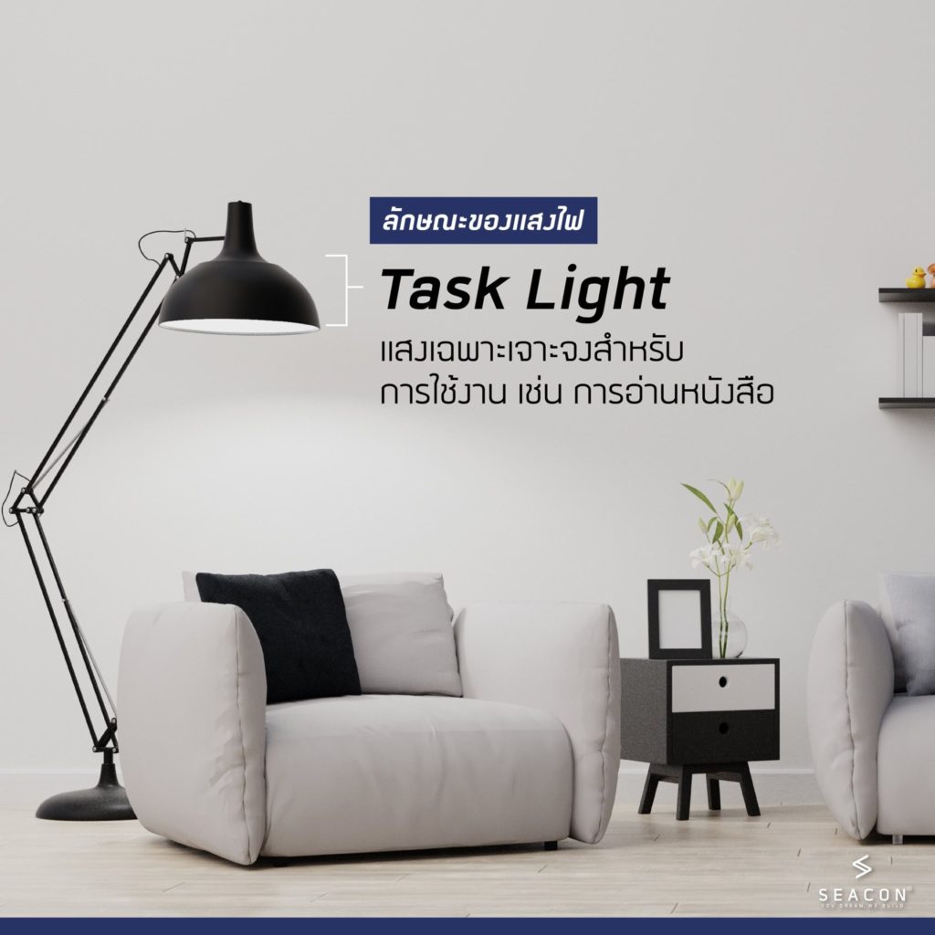 2. Task Light : แสงเฉพาะเพื่อการใช้งาน เป็นการจัดแสงเฉพาะเจาะจงสำหรับการใช้งานนั้น เช่น การอ่านหนังสือ การแต่งหน้าหน้ากระจก ไฟนี้สามารถติดตั้งบนผนัง ตั้งบนโต๊ะทำงาน หรือฝังกระจกได้ บางตัวสามารถหมุนได้ขึ้นอยู่กับความต้องการของคุณว่าจะต้องการให้มันอยู่ในมุมใด เช่น โคมไฟตั้งพื้น โคมไฟตั้งโต๊ะ โคมไฟหัวเตียง