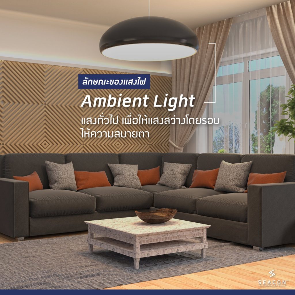 1. Ambient Light : แสงโดยรอบ เรียกอีกอย่างหนึ่งว่า แสงทั่วไป แสงชนิดนี้ทำหน้าที่พื้นฐานหลักเพื่อให้แสงสว่างโดยรอบ ให้ความสบายตา และสามารถให้เราทำงานในบริเวณนั้นได้อย่างสะดวก เช่น โคมไฟ Chandeliers, Pendants หรือโคมไฟ LED บนฝ้าเพดาน เป็นต้น