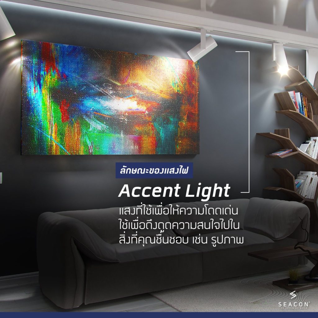 3. Accent Light : แสงที่ใช้เพื่อให้ความโดดเด่น แสงชนิดนี้ถูกใช้เพื่อดึงดูดความสนใจไปในสิ่งที่คุณชื่นชอบหรือของตกแต่ง เช่น รูปภาพ รูปปั้น โดยใช้โคมไฟ Picture light ยิงแสงเข้าไปที่วัตถุนั้น ๆ หรือหากต้องการไฮไลท์วัสดุบนผนังให้ดูโดดเด่นขึ้นมา อาจใช้โคมไฟ Wall light สาดแสงใส่กำแพง ซึ่งจะทำให้ห้องดูมีมิติ โดดเด่นยิ่งขึ้น