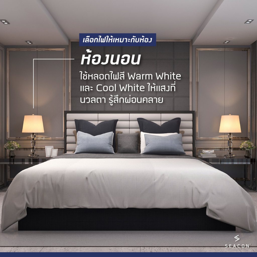 3. ห้องนอน ต้องการแสงที่อบอุ่น เพื่อการพักผ่อนนอนหลับได้อย่างสบาย ไร้กังวล อาจเลือกไฟประเภทแสงทั่วไป โดยใช้โคมไฟติดเพดาน และควรใช้หลอดไฟสี Warm White และ Cool White ให้แสงที่นวลตา สร้างบรรยากาศในการผ่อนคลายให้ดียิ่งขึ้น