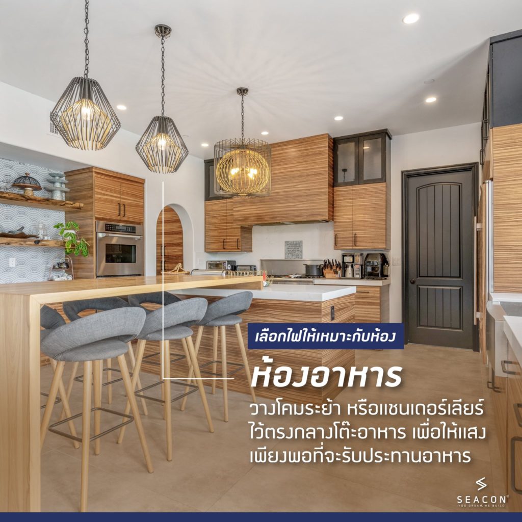 2. ห้องอาหาร ต้องการแสงสว่างที่เพียงพอเพื่อให้คุณสนทนาและรับประทานอาหารที่โต๊ะได้อย่างสะดวกสบาย ลองวางโคมระย้า หรือแชนเดอร์เลียร์ขนาดใหญ่ไว้ตรงกลางโต๊ะอาหาร แต่ไม่ควรใช้กับห้องที่มีเพดานเตี้ยเพราะจำทำให้ดูอึดอัด