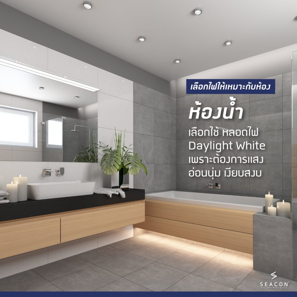 4. ห้องน้ำ มักเน้นบรรยากาศที่ดูแล้วรู้สึกสะอาดตา เงียบสงบ เราสามารถใช้ดวงไฟขนาดเล็กติดรอบ ๆ หรือติดด้านบนกระจกโดยใช้ไฟที่มีแสงที่อ่อนนุ่ม แต่สำหรับบางคนชอบแบบสว่างสดใส หลอดไฟที่ควรใช้ก็คือ หลอดไฟ Daylight White นอกจากนี้ยังสามารถใช้ไฟซ่อนผนัง เพื่อทำให้วัสดุและอุปกรณ์ภายในห้องน้ำดูเด่นขึ้นมาได้ด้วย