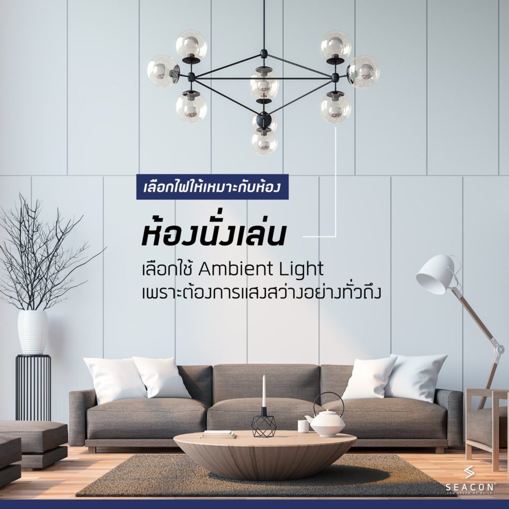 1. ห้องนั่งเล่น คือห้องเพื่อความบันเทิงเริงใจ ในขณะเดียวกันก็ช่วยสร้างความอบอุ่นให้กับสมาชิกในครอบครัว ด้วยเหตุนี้คุณจะต้องการแสงสว่างอย่างทั่วถึง โดยใช้แสง Ambient light แต่คุณก็ไม่จำเป็นต้องใช้แสงจ้าตลอดเวลา การใช้โคมไฟตั้งพื้นโดยแสง Task light ไปด้านบน จะสามารถเป็นเพื่อนที่ดีของคุณได้ และสร้างความโดดเด่นให้กับรูปภาพแขวนผนัง ตู้โชว์ หรือตู้เก็บของสะสมของคุณด้วยไฟ Accent light