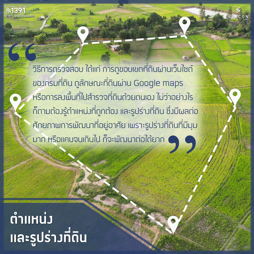 วิธีการตรวจสอบ ได้แก่ การดูขอบเขตที่ดินผ่านเว็บไซต์ของกรมที่ดิน👉 https://landsmaps.dol.go.th/ ดูลักษณะที่ดินผ่าน Google maps หรือการลงพื้นที่ไปสำรวจที่ดินด้วยตนเอง ไม่ว่าอย่างไรก็ตามต้องรู้ตำแหน่งที่ถูกต้อง และรูปร่างที่ดิน ซึ่งมีผลต่อศักยภาพการพัฒนาที่อยู่อาศัย เพราะรูปร่างที่ดินที่มีมุมมาก หรือแคบจนเกินไป ก็จะพัฒนาต่อได้ยาก