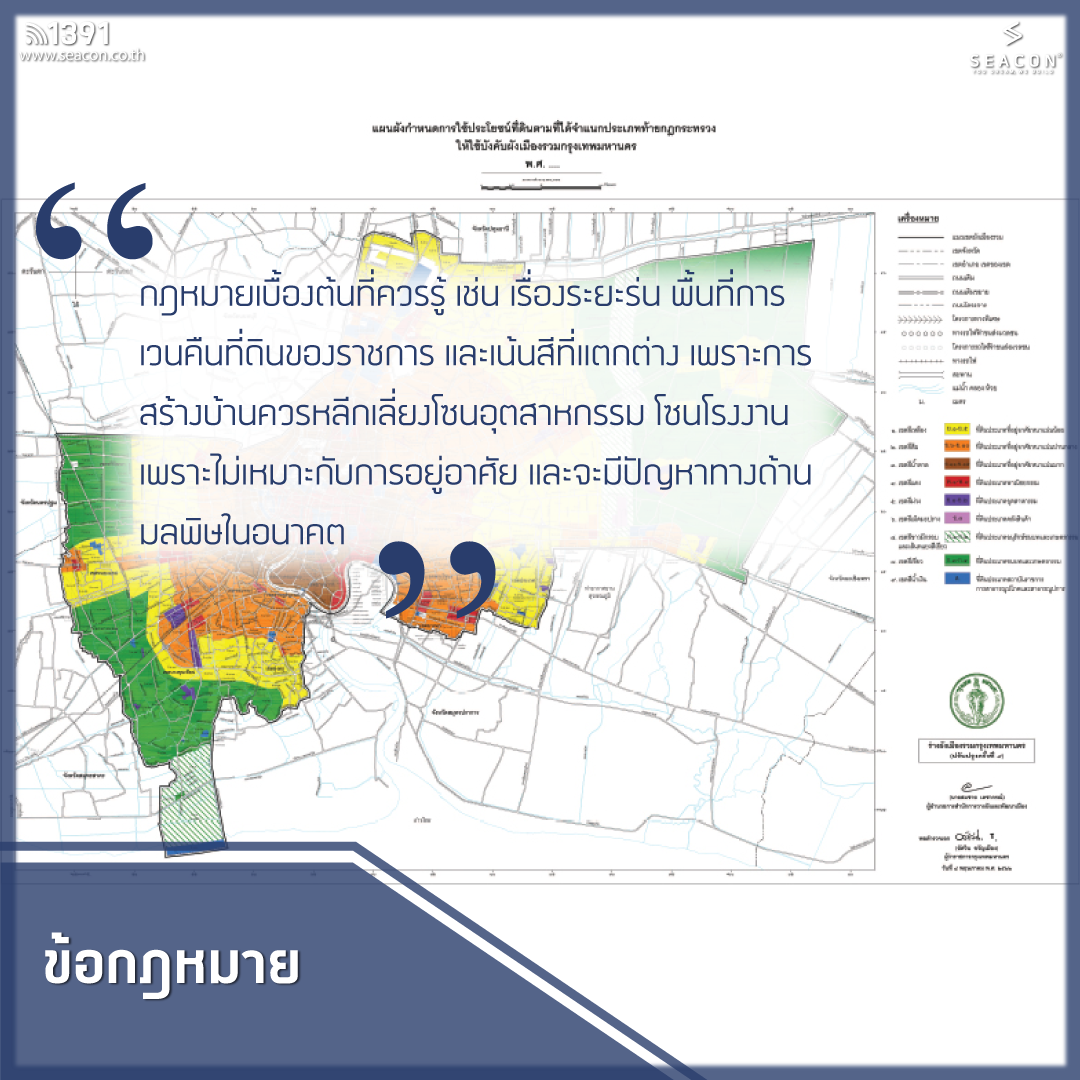 กฎหมายเบื้องต้นที่ควรรู้ เช่น เรื่องระยะร่น พื้นที่เวนคืนที่ดินของราชการ และเน้นสีที่แตกต่าง เพราะการสร้างบ้านควรหลีกเลี่ยงโซนอุตสาหกรรม โซนโรงงาน ฯลฯ เพราะไม่เหมาะกับการอยู่อาศัย และจะมีปัญหาทางด้านมลพิษในอนาคต อีกทั้งเปอร์เซ็นต์ของพื้นที่ชุ่มน้ำต่อการปลูกสร้างบ้านตามผังสีเมืองก็มีผลต่อขนาดพื้นที่ใช้สอยของบ้านด้วย