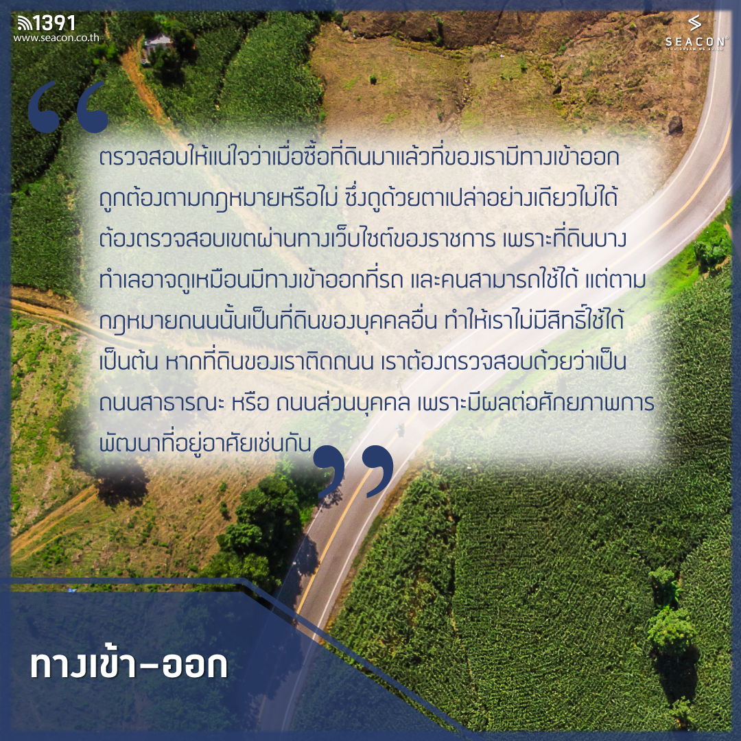 ต้องตรวจสอบให้แน่ใจว่าเมื่อเราซื้อที่ดินมาแล้วที่ของเรามีทางเข้าออกถูกต้องตามกฎหมายหรือไม่ ซึ่งวิธีนี้อาจดูด้วยตาเปล่าอย่างเดียวไม่ได้ ต้องตรวจสอบเขตผ่านทางเว็บไซต์ของราชการ เพราะที่ดินบางทำเลอาจดูเหมือนมีทางเข้าออกที่รถ และคนสามารถใช้ได้ แต่ตามกฎหมายถนนนั้นเป็นที่ดินของบุคคลอื่น ทำให้เราไม่มีสิทธิ์ใช้ได้ เป็นต้น หากที่ดินของเราติดถนน เราต้องตรวจสอบด้วยว่าเป็นถนนสาธารณะ หรือถนนส่วนบุคคล เพราะมีผลต่อศักยภาพการพัฒนี่อยู่อาศัยเช่นกัน