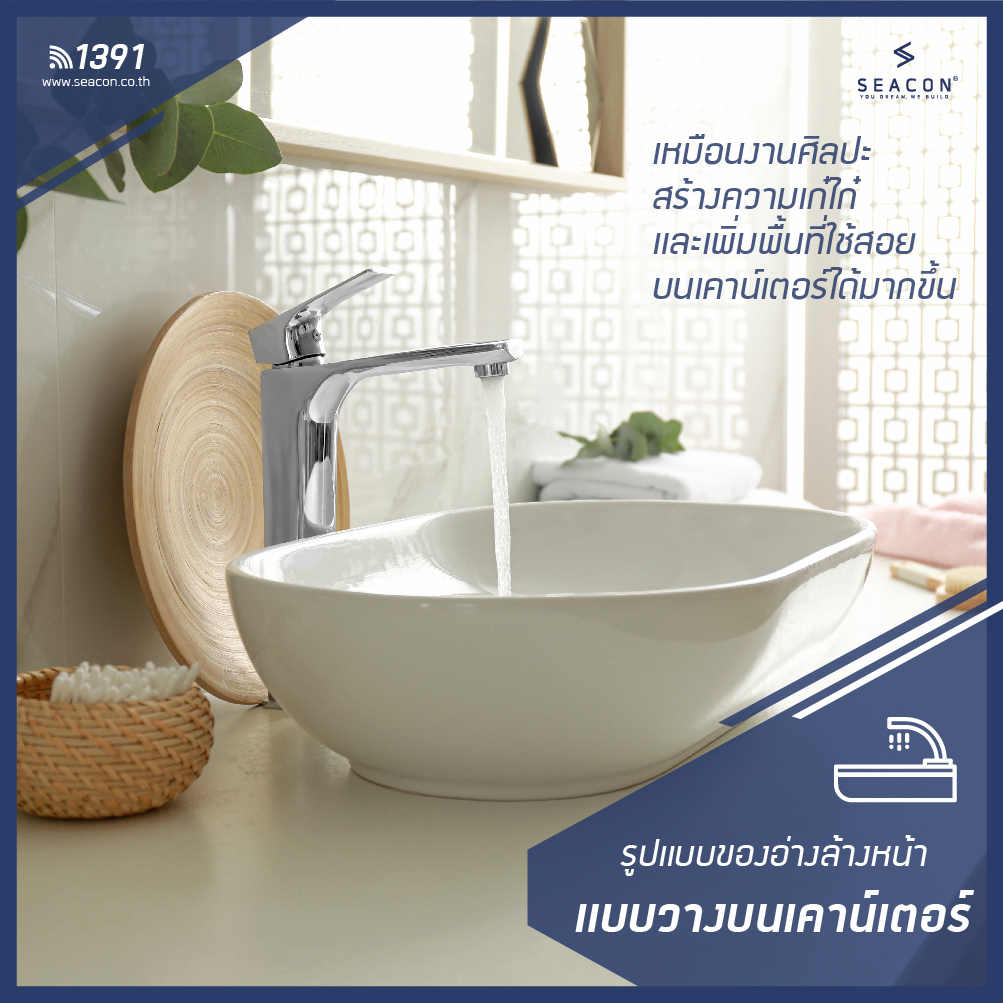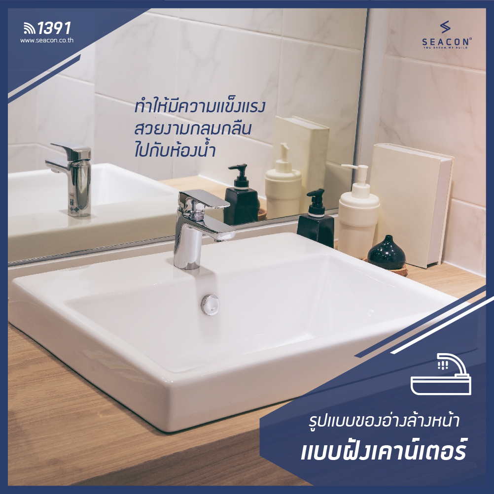 – แบบวางบนเคาน์เตอร์ เป็นการเพิ่มดีไซน์ให้ห้องน้ำของคุณ โดยการนำอ่างล้างหน้าสวย ๆ มาวางไว้บนเคาน์เตอร์ได้เลย คุณสามารถโชว์อ่างได้เหมือนงานศิลปะชิ้นหนึ่ง สร้างความเก๋ไก๋ พร้อมพื้นที่ใช้สอยบริเวณเคาน์เตอร์ที่มากขึ้น
