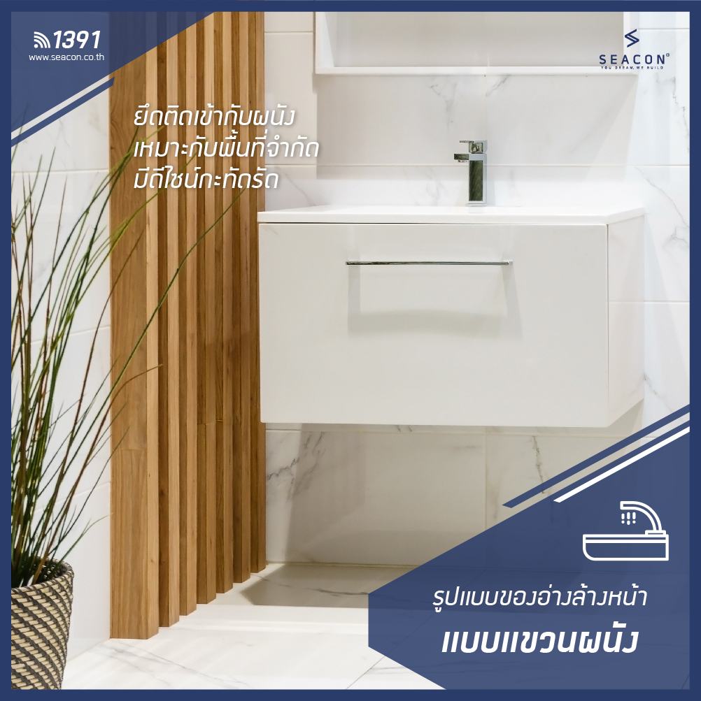 – แบบแขวนผนัง เป็นการนำอ่างล้างหน้ายึดติดเข้ากับผนัง เหมาะกับพื้นที่จำกัด ดีไซน์กะทัดรัด สามารถติดตั้งเข้าได้กับทุกมุมของห้องน้ำ การติดตั้งสะดวกและรวดเร็ว