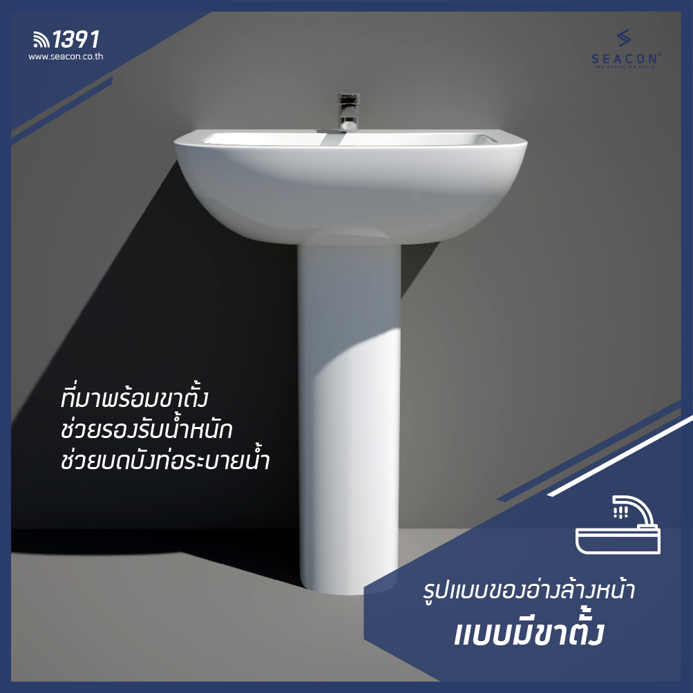 – แบบมีขาตั้ง เป็นอ่างล้างหน้าที่มาพร้อมขาตั้ง ช่วยรองรับน้ำหนักของอ่าง อีกทั้งยังช่วยบดบังท่อระบายน้ำได้อีกด้วย เหมาะกับพื้นที่จำกัด ช่วยให้ห้องน้ำดูสบายตา แต่ข้อเสียคือไม่มีที่เก็บของ