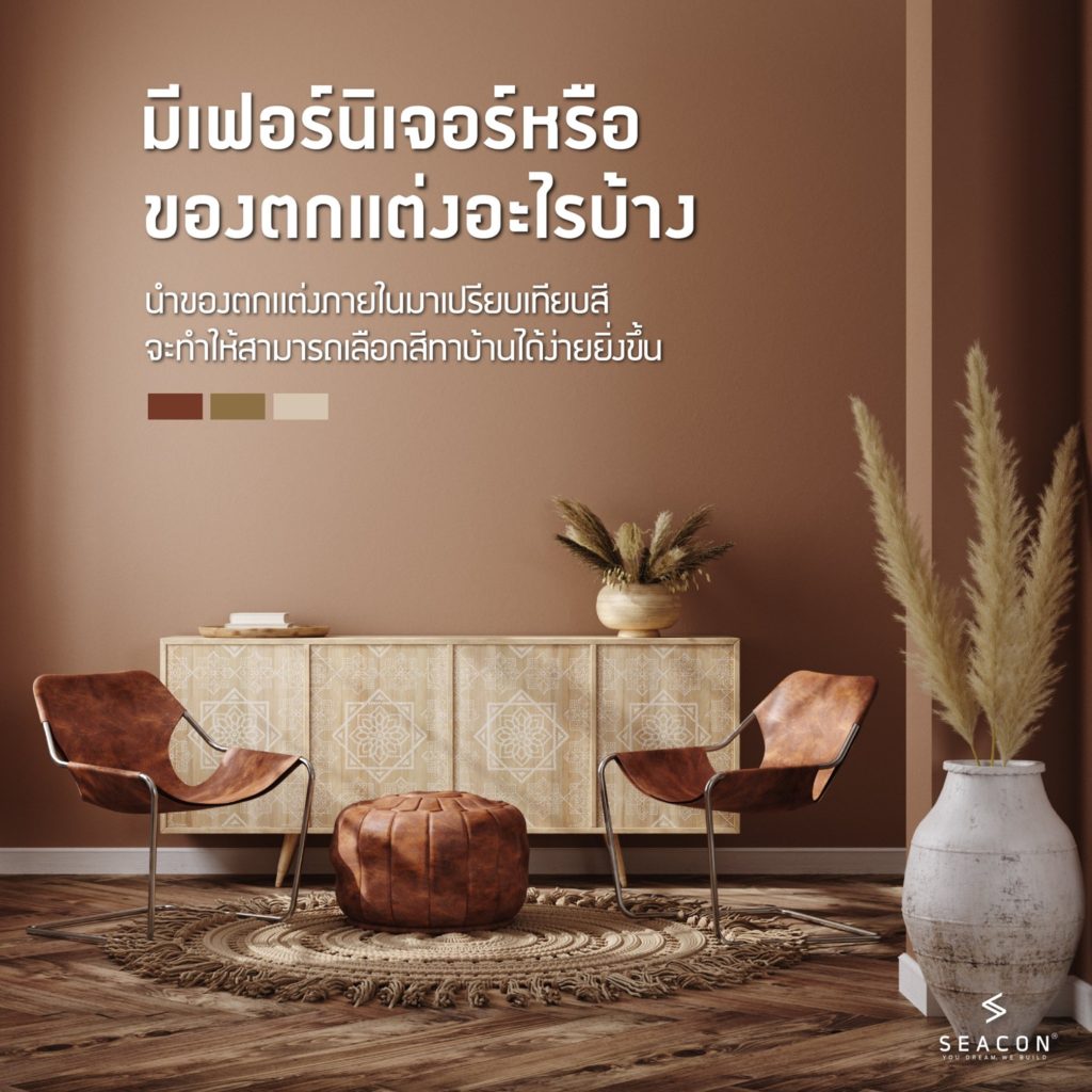 การนำเฟอร์นิเจอร์ หรือของตกแต่งภายในบ้าน มาเปรียบเทียบ จะทำให้สามารถเลือกสีทาบ้านได้ง่ายยิ่งขึ้น เพียงปรับเฉดสีอ่อนหรือเข้ม ก็สามารถทำให้เกิดความลงตัวได้อย่างง่ายดาย