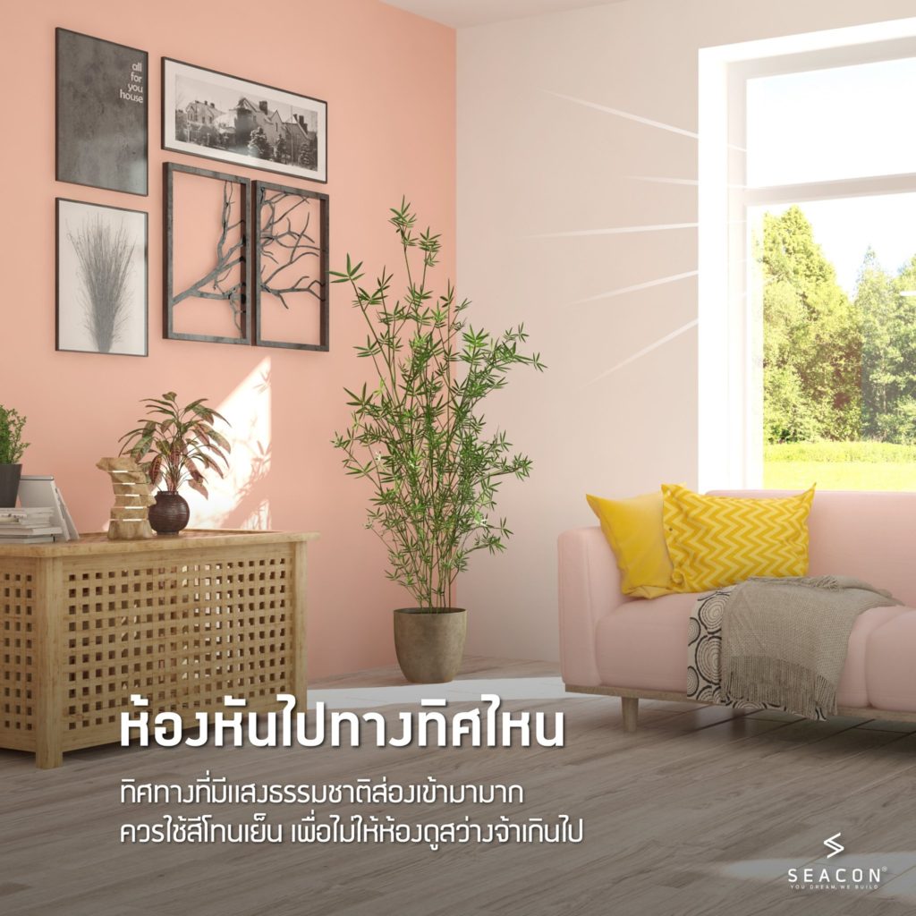 หากห้องหันหน้าไปในทิศทางที่มีแสงธรรมชาติส่องเข้ามามาก ควรใช้สีโทนเย็นเพื่อไม่ให้ห้องดูสว่างจ้าเกินไป แต่หากห้องหันไปในทิศที่มีแสงธรรมชาติน้อย ควรชดเชยหรือเพิ่มความเข้มให้กับผนังด้วยเฉดสีอ่อนโทนอบอุ่น
