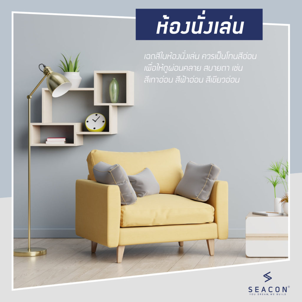 1. ห้องนั่งเล่น ไม่ว่าคุณจะต้องการพื้นที่ที่สดใสร่าเริง หรือโซนพักผ่อนหย่อนใจ เฉดสีในห้องนั่งเล่น ควรเป็นโทนสีอ่อน เพื่อให้ดูผ่อนคลาย สบายตา เช่น สีเทาอ่อน ให้ความเก๋และผ่อนคลาย แถมยังเข้ากับเฉดสีต่าง ๆ ภายในห้องได้อย่างง่ายดาย แต่หากคุณต้องการความเย็นสบาย แนะนำสีฟ้าอ่อน แต่หากคุณต้องการห้องนั่งเล่นที่สงบ กลมกลืนไปธรรมชาติแล้วล่ะก็ สีเขียวอ่อนน่าจะถูกใจคุณ
