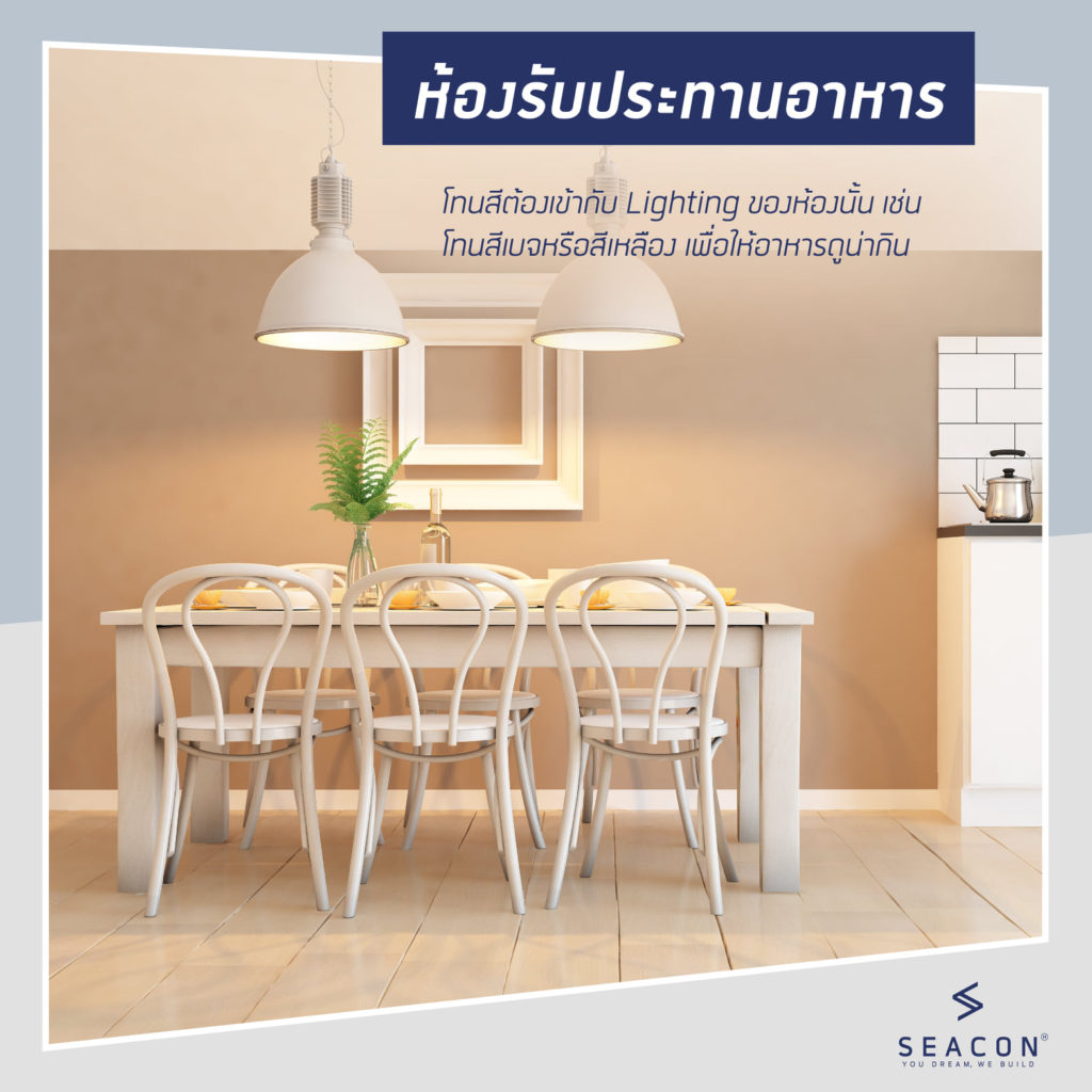 2. ห้องรับประทานอาหาร เป็นอีกห้องหนึ่งที่สมาชิกในครอบครัวจะมารวมตัวกัน ร่วมสนทนา เฮฮา ปาร์ตี้ สีที่ใช้ควรเป็นสีอบอุ่น ที่สำคัญโทนสีต้องเข้ากับ Lighting ของห้องนั้น เช่น โทนสีเบจ / เหลือง เพื่อให้อาหารดูน่ารับประทาน และสร้างบรรยากาศที่ดียิ่งขึ้น