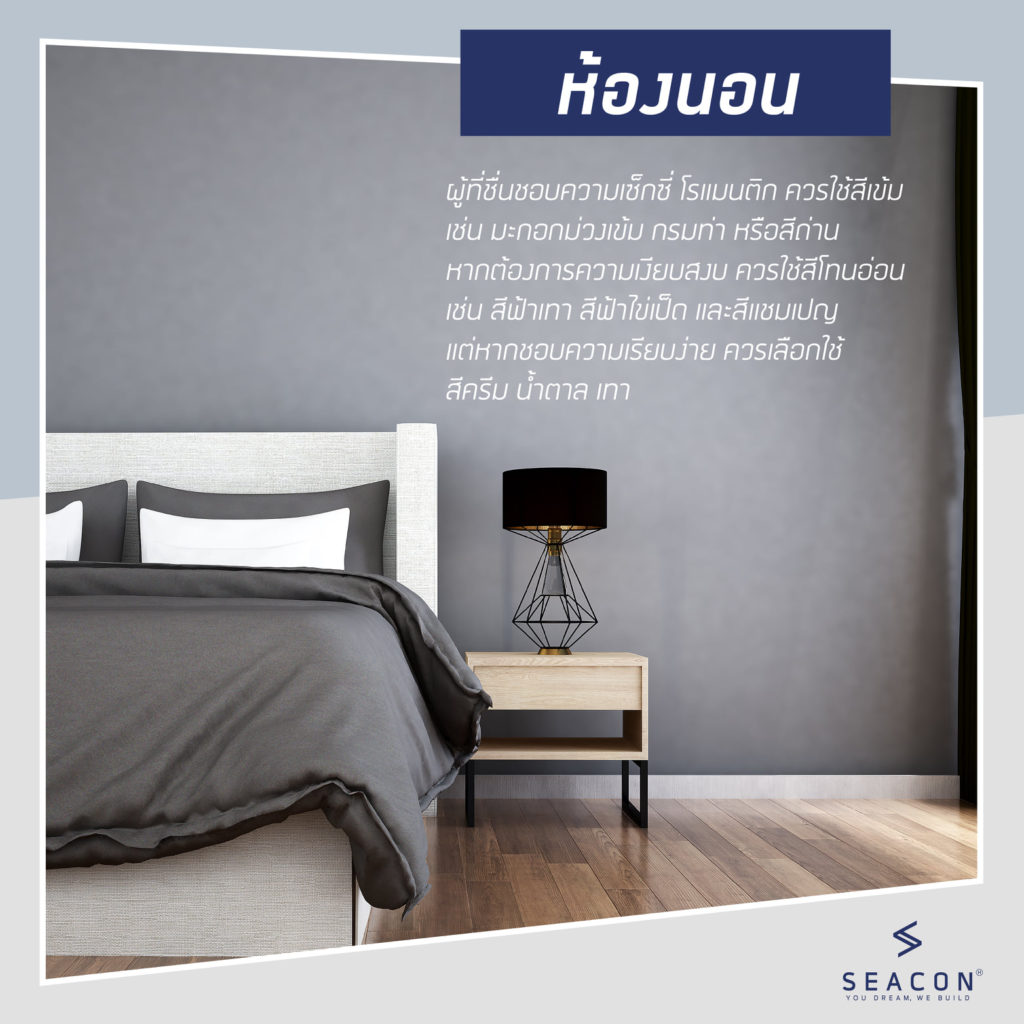 สำหรับผู้ที่ต้องการความเงียบสงบ และมีความสุข แนะนำให้เลือกใช้สีโทนอ่อน เช่น สีฟ้าเทา สีฟ้าไข่เป็ด และสีแชมเปญ