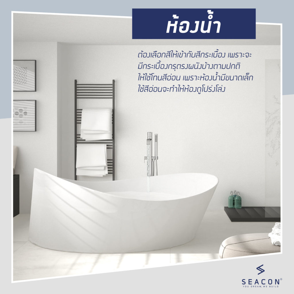 4. ห้องน้ำ ควรเลือกสีให้เข้ากับสีกระเบื้อง เพราะจะมีกระเบื้องกรุตรงผนังบ้างตามปกติ ควรใช้โทนสีอ่อน เพราะห้องน้ำมีขนาดเล็ก การใช้สีอ่อนจะทำให้ห้องน้ำดูโปร่งโล่งขึ้น