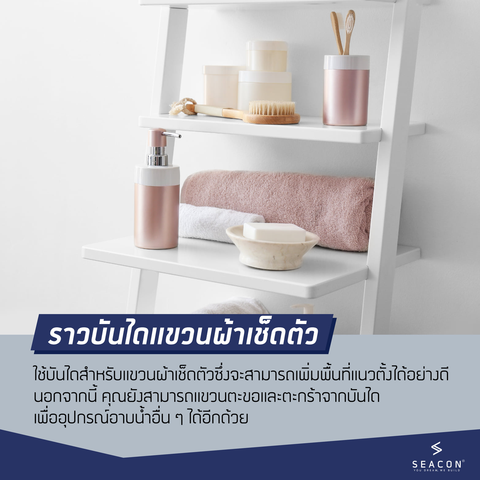 วิธีแขวนผ้าเช็ดตัวที่ง่ายที่สุดในห้องน้ำ คือการเพิ่มตะขอหรือราวแขวนเข้ากับผนัง แต่หากคุณต้องการห้องน้ำที่ทันสมัยดีไซน์เก๋ ลองใช้บันไดสำหรับแขวนผ้าเช็ดตัวซึ่งจะสามารถเพิ่มพื้นที่แนวตั้งได้อย่างดี นอกจากนี้ คุณยังสามารถแขวนตะขอและตะกร้าจากบันไดเพื่ออุปกรณ์อาบน้ำอื่น ๆ ได้อีกด้วย