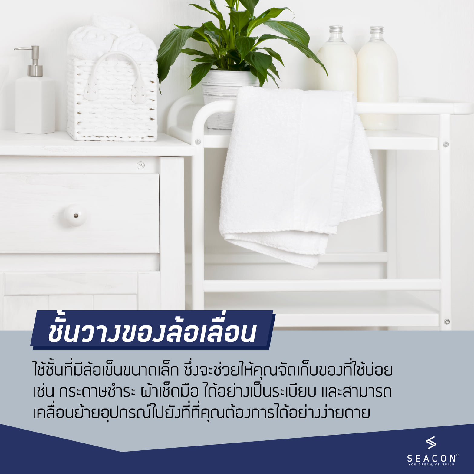 หากห้องน้ำของคุณมีพื้นที่เพิ่มขึ้นเล็กน้อย อาจเพิ่มออแกไนเซอร์ที่เป็นชั้น ๆ อาจใช้ชั้นที่มีล้อเข็นขนาดเล็ก ซึ่งจะช่วยให้คุณจัดเก็บของที่ใช้บ่อย เช่น กระดาษชำระ ผ้าเช็ดมือ ได้อย่างเป็นระเบียบ และสามารถเคลื่อนย้ายอุปกรณ์ไปยังที่ที่คุณต้องการได้อย่างง่ายดาย