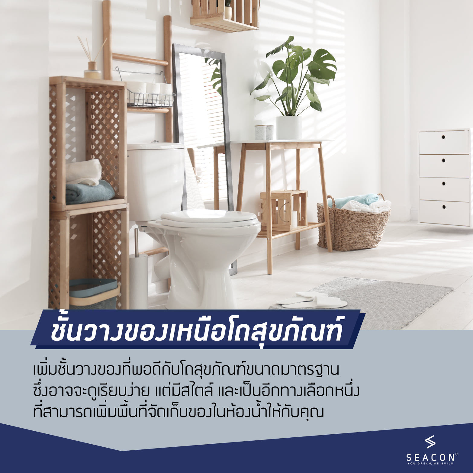 เพิ่มชั้นวางของที่พอดีกับโถสุขภัณฑ์ขนาดมาตรฐาน ซึ่งอาจจะดูเรียบง่าย แต่มีสไตล์ และเป็นอีกทางเลือกหนึ่งที่สามารถเพิ่มพื้นที่จัดเก็บของในห้องน้ำให้กับคุณ