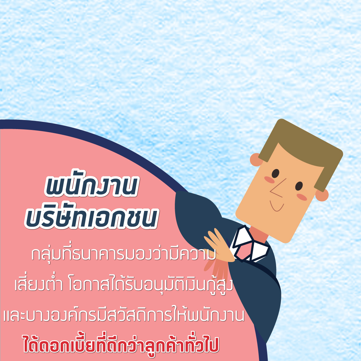 กลุ่มพนักงานเอกชนมีรายได้ประจำเป็นอีกกลุ่มที่ธนาคารมองว่ามี #ความเสี่ยงต่ำ ในการปล่อยกู้สินเชื่อบ้าน เพราะแม้มีโอกาสบ้างที่พนักงานเอกชนจะถูกลดเงินเดือน ถูกให้ออก หรือบริษัทปิดตัวลง แต่พนักงานมักจะไม่มีหนี้สินจากการทำธุรกิจ ทำให้ความเสี่ยงต่ำ และโอกาสได้รับอนุมัติเงินกู้มีสูงเช่นกัน