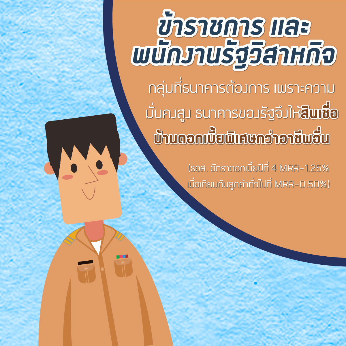 – ปีที่ 4 เป็นต้นไป ลูกค้าสวัสดิการ อัตราดอกเบี้ย MRR -1.00% และลูกค้าทั่วไป อัตราดอกเบี้ย MRR -0.50%