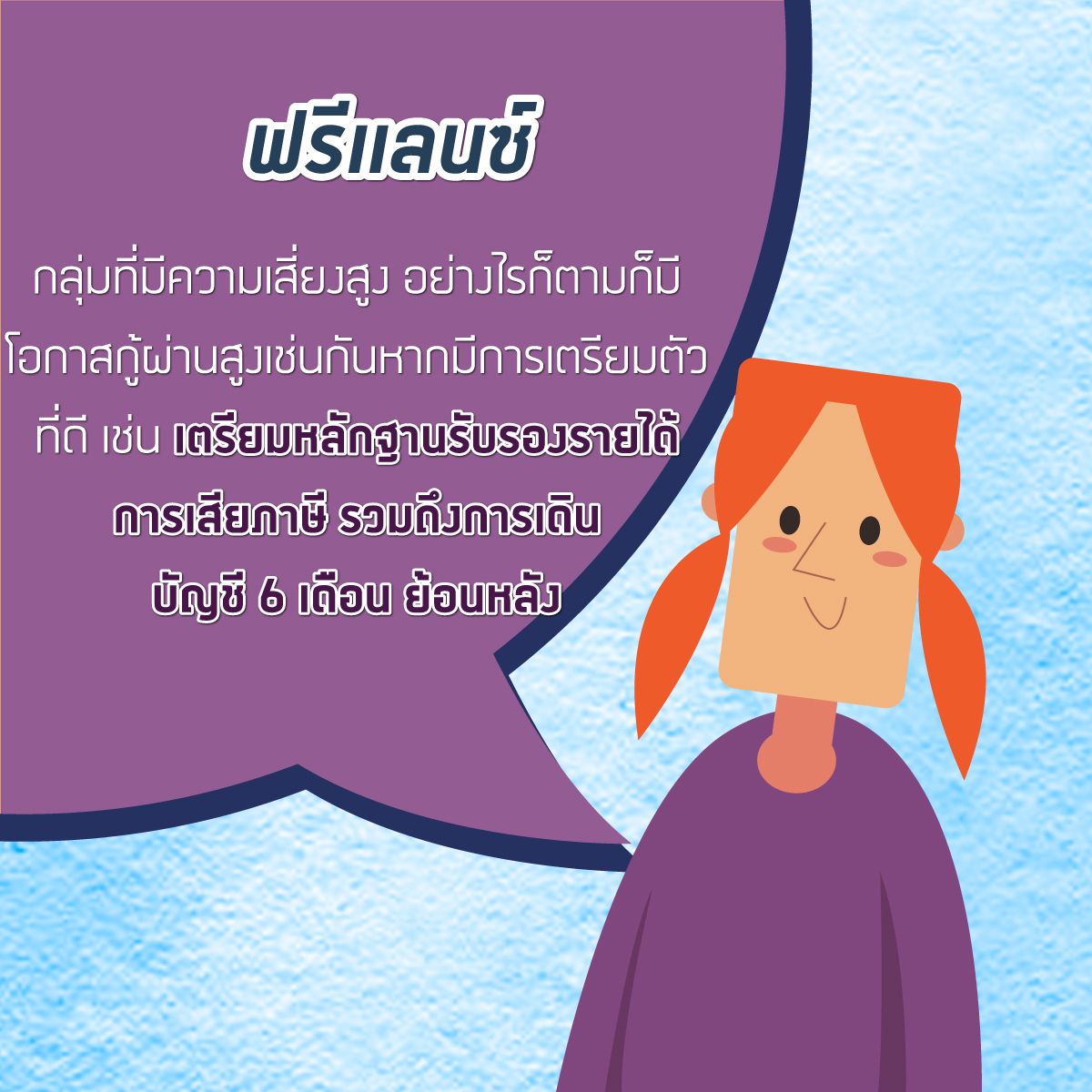 สำหรับกลุ่มอาชีพเหล่านี้ไม่ว่าจะเป็นค้าขายขนาดเล็ก ไปจนถึงอาชีพรับจ้าง ฟรีแลนซ์ ล้วนเป็น #กลุ่มเสี่ยงที่สุด เพราะแหล่งรายได้มีความเสี่ยงที่จะถูกกระทบจากภาวะเศรษฐกิจได้ง่าย แม้ว่ากลุ่มอาชีพอื่น เช่น SME อาจจะมีรายได้ต่อเดือนสูงกว่ามนุษย์เงินเดือนทั่วไป ทางธนาคารก็จะประเมินว่าเป็นอาชีพที่ไม่มั่นคงเช่นกัน