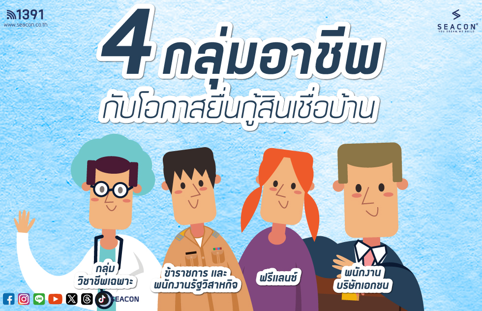 แต่คุณสมบัติที่สำคัญอีกสิ่งหนึ่งที่ธนาคารต้องพิจารณาควบคู่ไปด้วยนั่นก็คือ “อาชีพของผู้กู้” เพราะเป็นสิ่งที่บ่งบอกถึงความมั่นคง ความสม่ำเสมอของแหล่งรายได้ วันนี้ซีคอนได้รวบรวมข้อมูลให้กับ 4 กลุ่มอาชีพ กับโอกาสในการยื่นกู้สินเชื่อบ้าน มาให้อ่านกัน คลิกที่รูปเพื่ออ่านได้เลยครับ