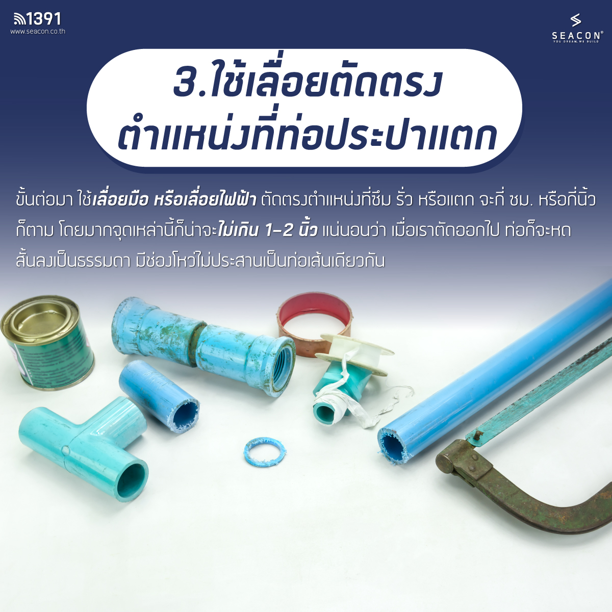 3. ใช้เลื่อยตัดตรงตำแหน่งที่ท่อประปาแตก
