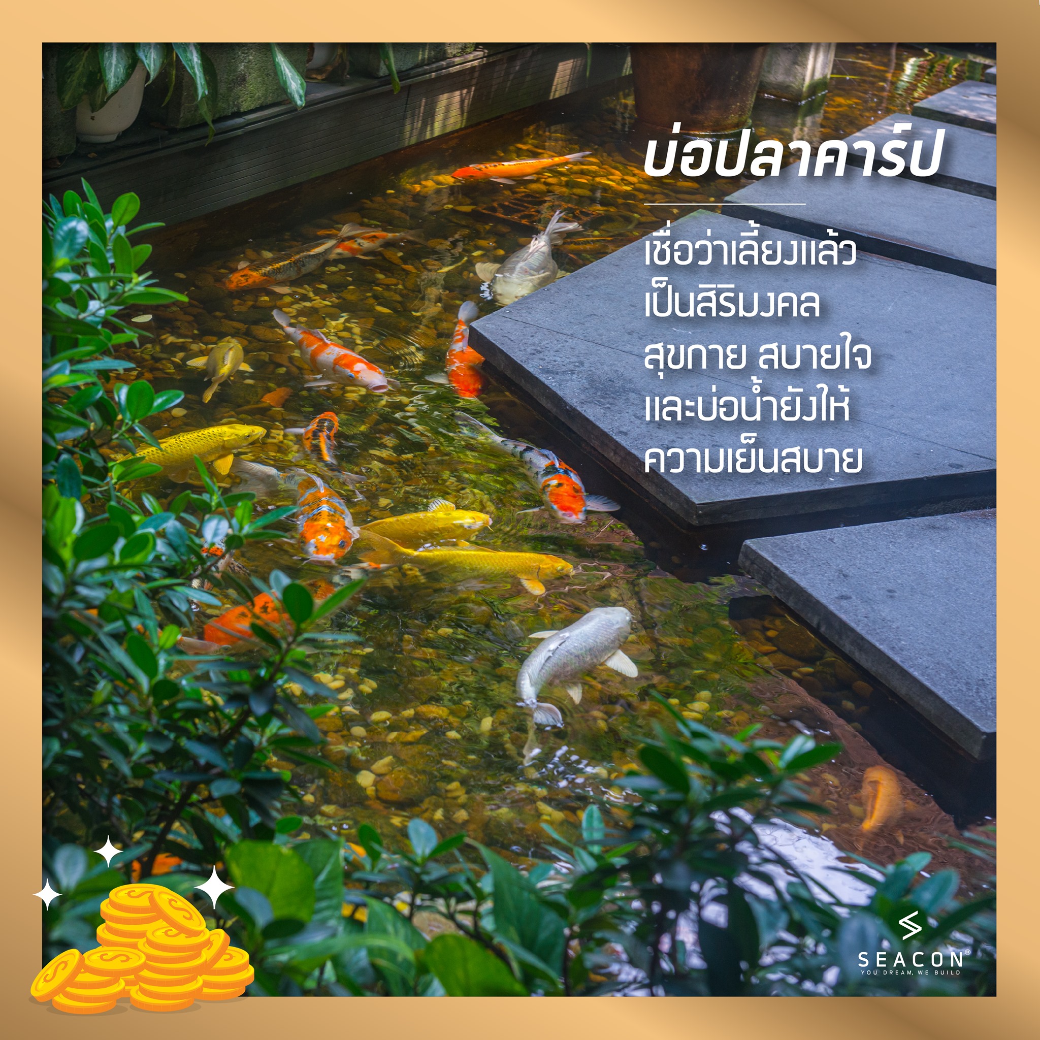 2. บ่อปลาคาร์ป ปลาคาร์ปได้ชื่อว่าเลี้ยงแล้วเป็นสิริมงคล เพราะเป็นปลาสวยงาม ทำให้ผู้เลี้ยงมีความสุขกาย สบายใจ อีกทั้งบ่อน้ำยังให้ความเย็นสบาย แต่อย่าลืมเลือกทิศทางให้เหมาะกับบ่อปลา ที่แสงน้ำจะไม่สะท้อนเข้าตาคนในบ้านด้วยนะครับ