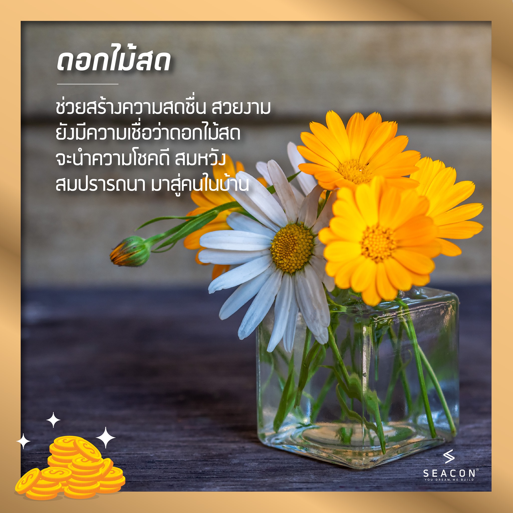 7. ดอกไม้สด นอกจากจะช่วยสร้างความสดชื่น สดใส สวยงาม ให้กับบ้านแล้ว ยังมีความเชื่อว่าดอกไม้สดจะนำความโชคดี สมหวัง สมปรารถนา มาสู่คนในบ้าน