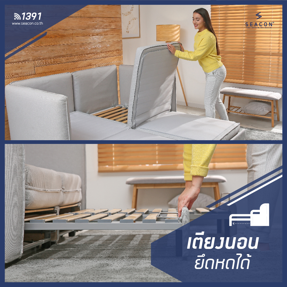 1. เตียงนอนยึดหดได้ หากคุณต้องการนอนหลับพักผ่อนอย่างจริงจัง เพียงแค่ดึงโครงเตียงออกมาแล้วกางเบาะออกก็สามารถนอนหลับได้สบาย หรือถ้าหากเพียงแค่อยากนั่งเล่น ก็พับเก็บเป็นโซฟาเก๋ ๆ ช่วยให้ห้องดูโล่งขึ้นได้