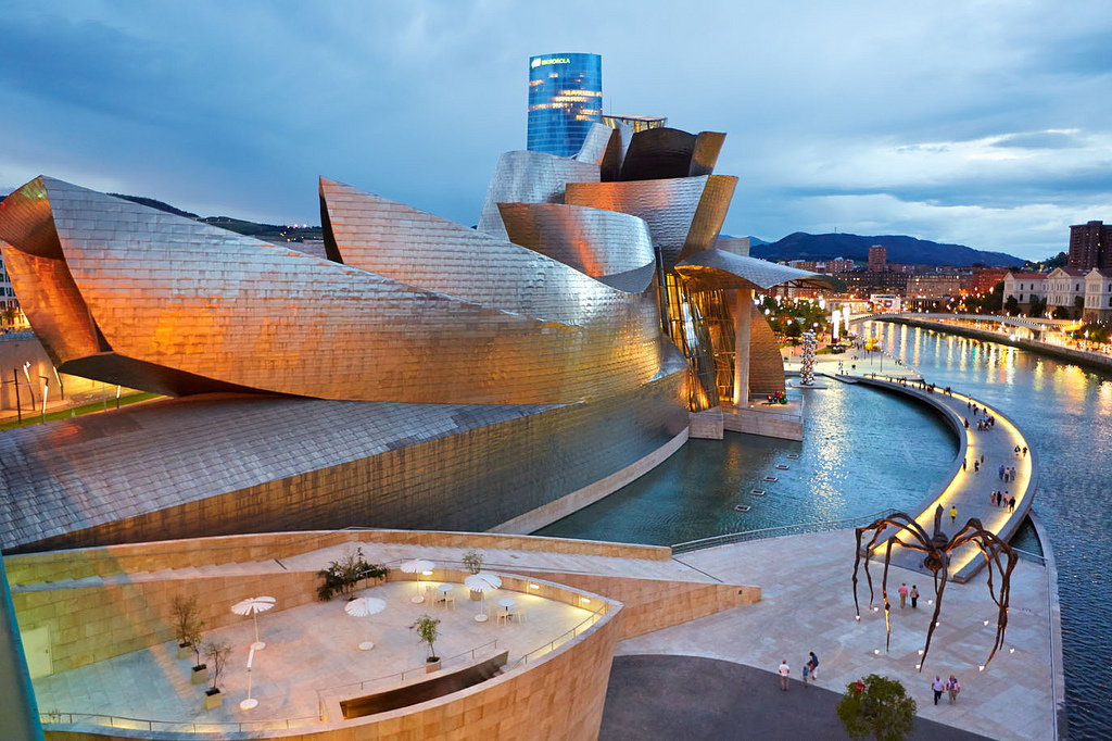 4. The Guggenheim Museum Bilbao พิพิธภัณฑ์ศิลปะตั้งอยู่ในกรุงบิลเบา ประเทศสเปน ออกแบบโดยสถาปนิก Frank Gehry อาคารแห่งนี้สร้างจากไทเทเนียม และกระจก มีลักษณะคล้ายกับเรือใบ พิพิธภัณฑ์แห่งนี้ได้รับการออกแบบให้เป็นสถานที่จัดแสดงผลงานศิลปะสมัยใหม่ และร่วมสมัย