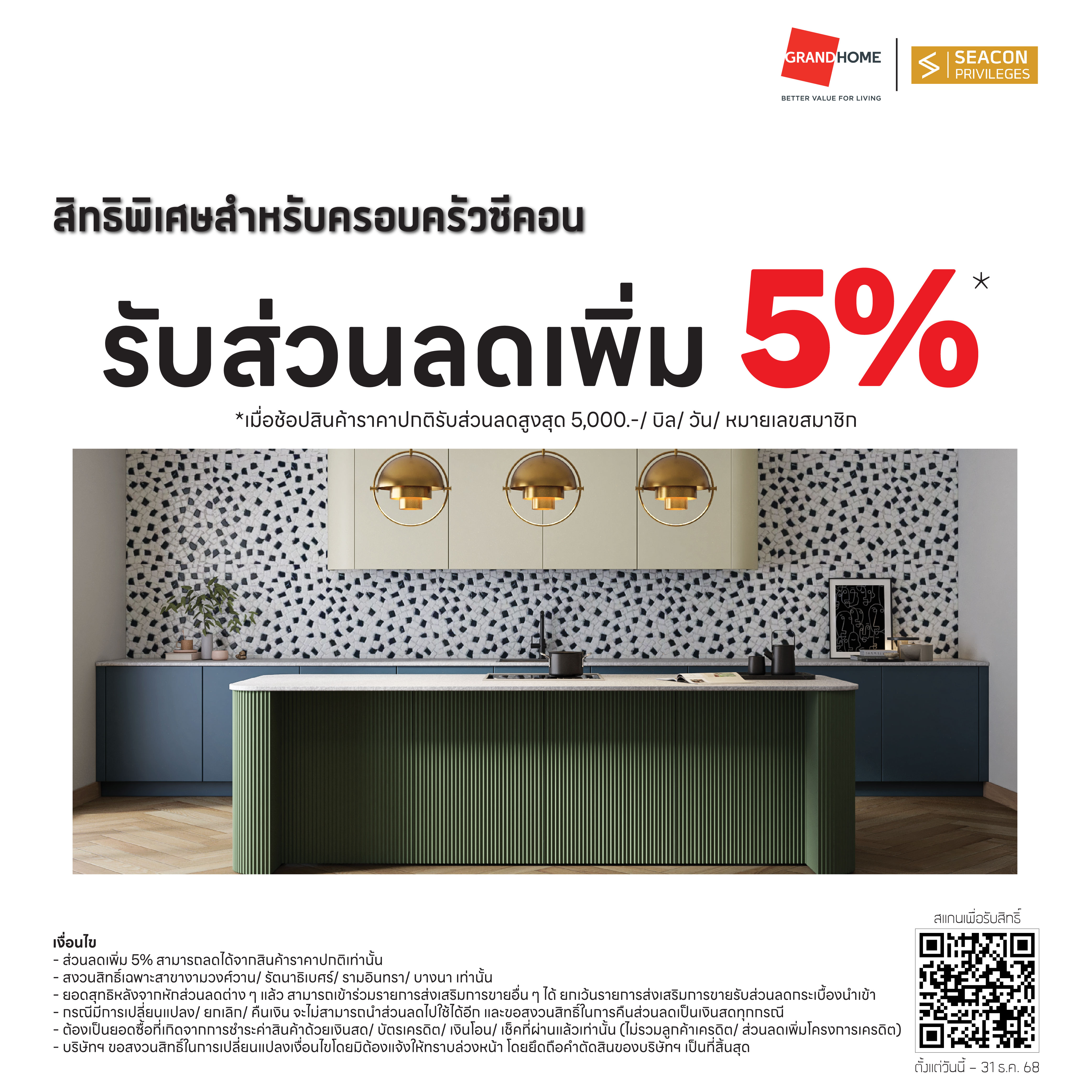 ผู้นำเรื่องกระเบื้องและวัสดุตกแต่งบ้านที่อยู่คู่เมืองไทยมานานกว่า 4 ทศวรรษ มอบส่วนลด 5% ให้ลูกค้าซีคอน เมื่อช้อปสินค้า ที่แกรนด์โฮม ทุกสาขา (สาขางามวงศ์วาน, สาขาบางนา, สาขารัตนาธิเบศร์, สาขารามอินทรา, สาขาบางบัวทอง, สาขาเดอะคริสตัล เอสบี ราชพฤกษ์)