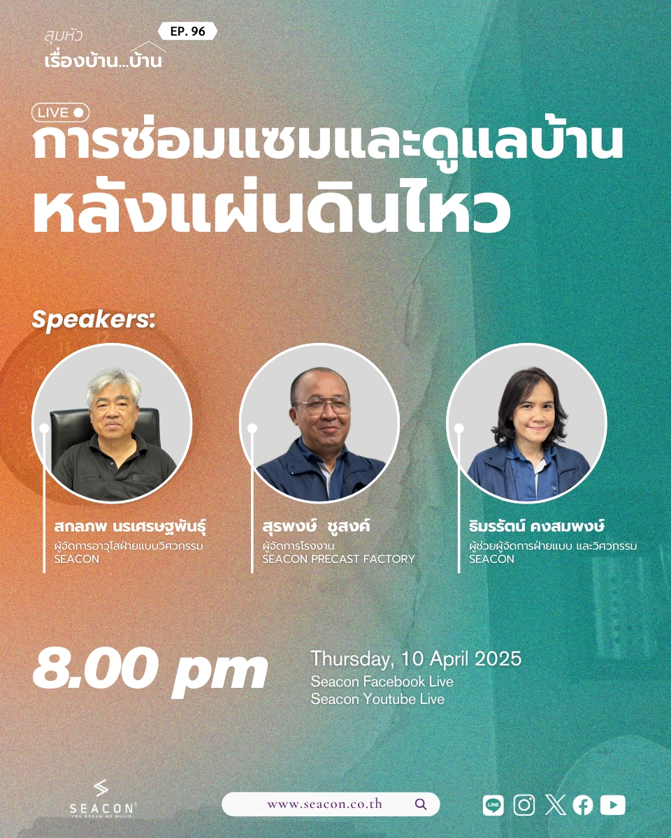 หลังเหตุการณ์แผ่นดินไหว…บ้านคุณพร้อมแค่ไหน? มาสุมหัวพูดคุยกับผู้เชี่ยวชาญจากซีคอน ที่จะมาแชร์เคล็ดลับการซ่อมแซม และดูแลบ้านให้มั่นคง ปลอดภัย พร้อมรับมือทุกสถานการณ์! ในหัวข้อ “การซ่อมแซม และดูแลบ้านหลังแผ่นดินไหว”